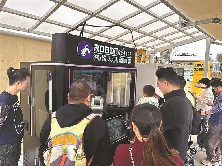 AI咖啡智能服务位于星光草坪,引来不少市民驻足。安诺机器人精准执行识别、定制、冲泡全流程,一杯个性化的咖啡在机械臂翻转间悄然完成。