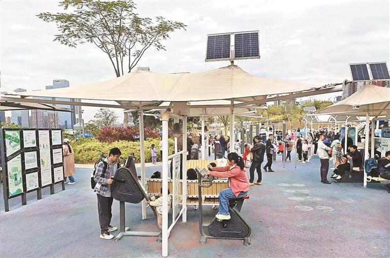 而儿童乐园旁的AI智能户外健身器材区,则融合人工智能、物联网与大健康理念,为市民提供有氧、力量、柔韧等12项智能训练体验。器材实时监测运动数据,给出科学指导,让健身更智能、更精准。