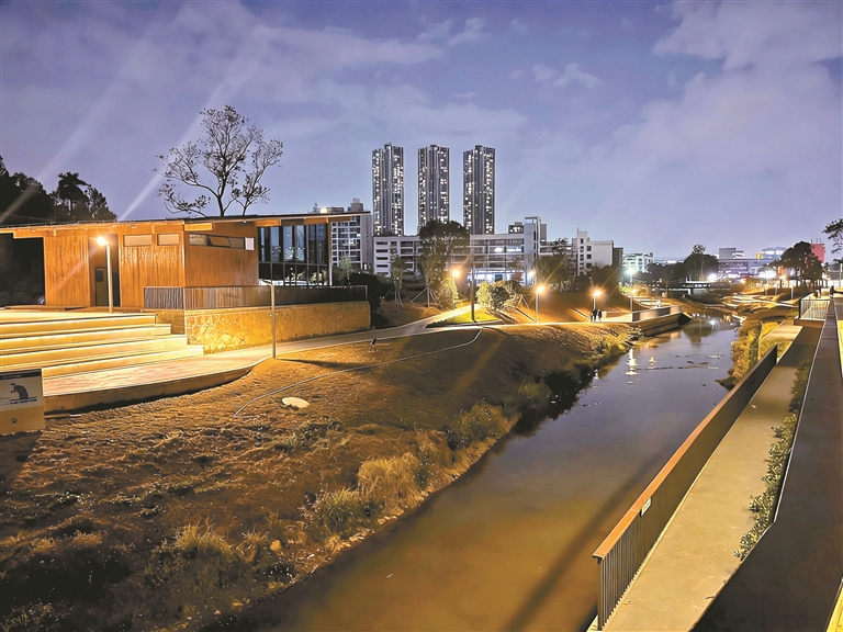 夜幕下的君子布河(龙华段)碧道。