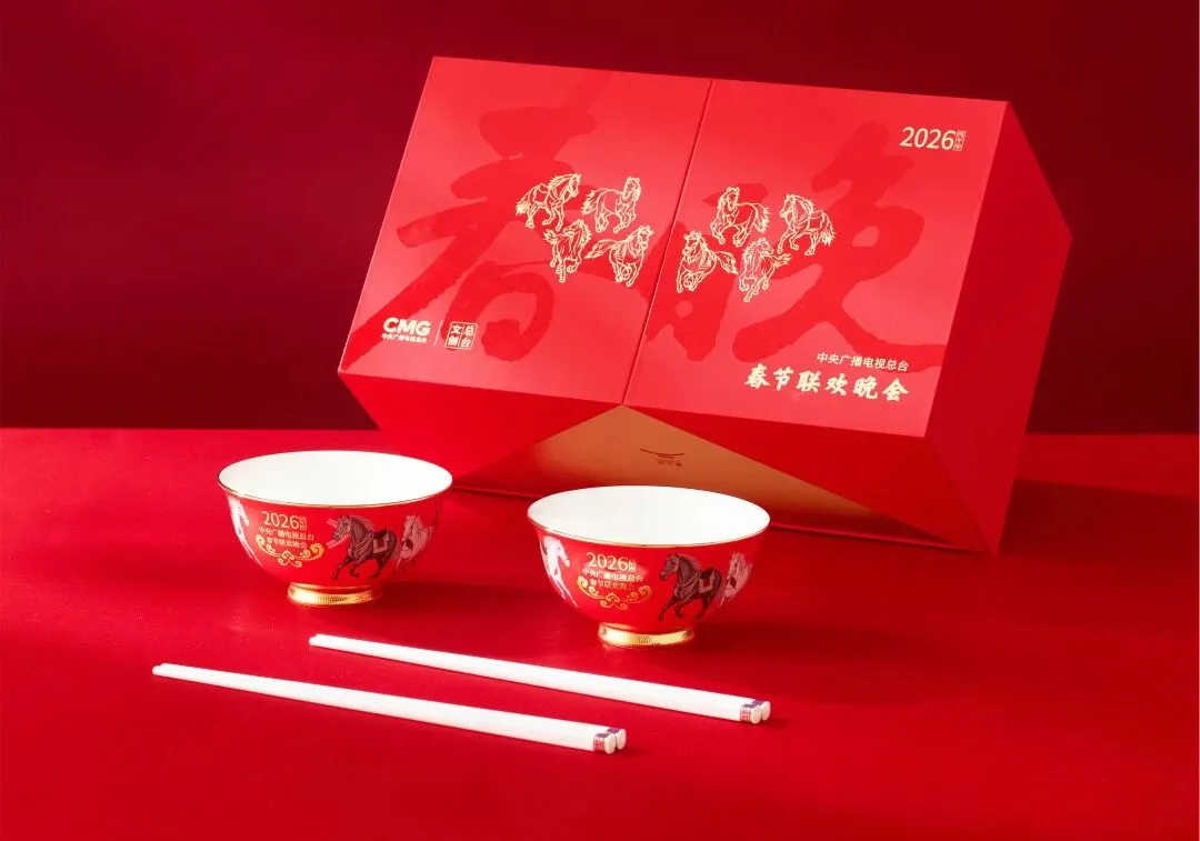 这次亮相春晚的核心产品有典藏款马到成功金春碗。这是总台文创历史上首次发行的金碗类产品,堪称现象级升级。它采用了国瓷永丰源独有的多层次高精度芯片级浮雕叠印技术,让碗身的骏马图案肌理分明、极具动感,被誉为“中国人的金饭碗”,寓意捧金纳福,财满家圆。另外,还包括象征同心团圆的十二骏摆盘。以及平衡了传统茶道与现代生活的茶咖具等,将福、禄、寿、喜、财等多元吉祥文化融入现代生活。