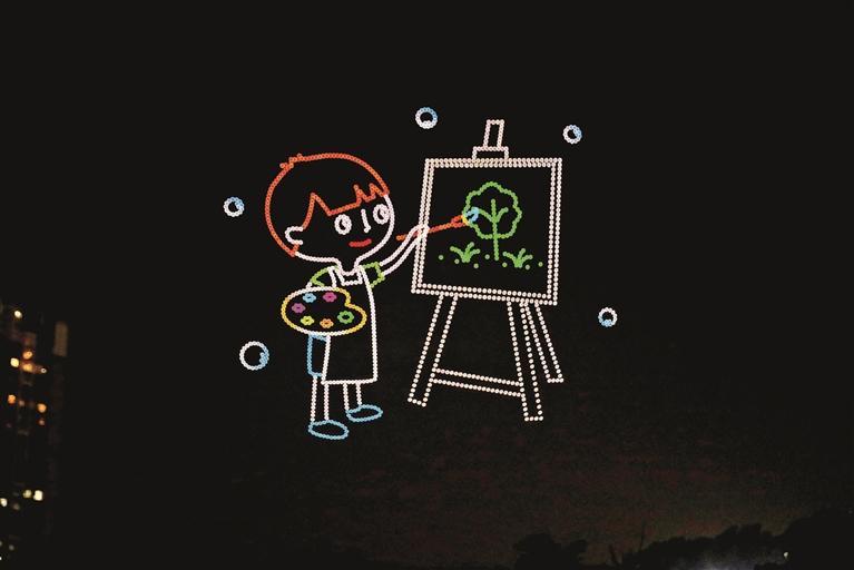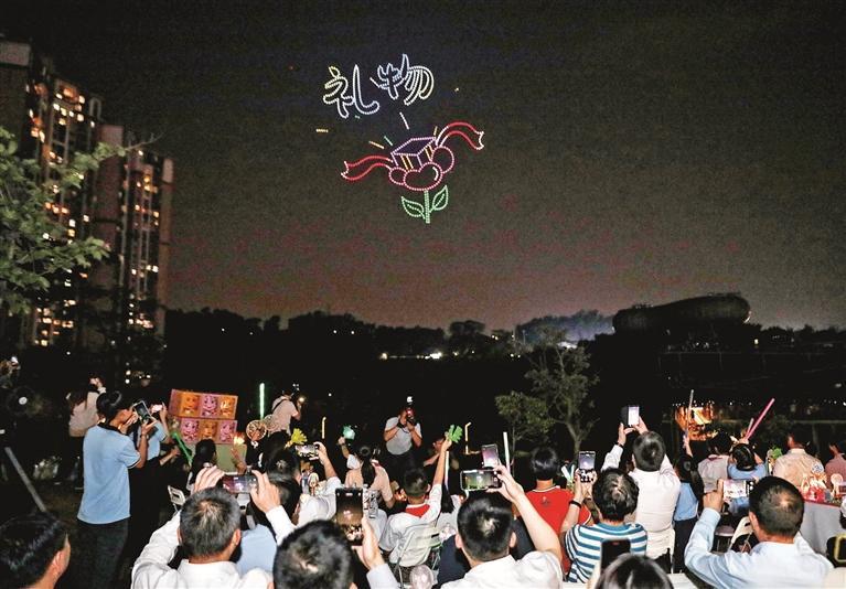 无人机编队在夜空中展现天真童趣、温馨祝福和龙华元素。