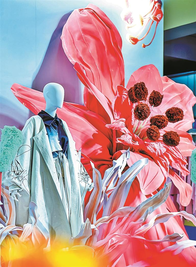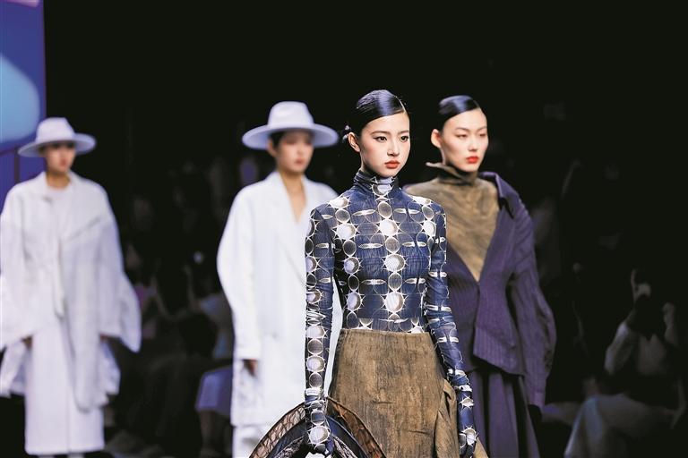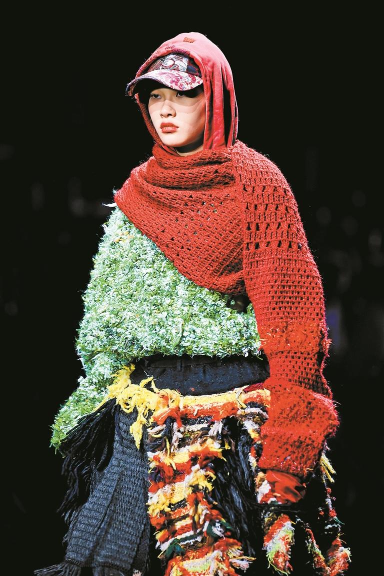 这些创作者的设计逻辑成熟完整,敏锐聚焦于玉兰、柳编、麦穗、皮影、窗格等中华优秀传统文化中“小而美”的具象元素,积极探索材质边界,从天然矿石、泥塑土坯等非传统领域汲取灵感,注重工艺研究与穿着体验,成功将跨界材料融入设计,实现创意与商业的无缝衔接。设计师们积极践行“零浪费”可持续理念,通过重塑废弃布料、二次创作编织袋、回收闲置衣物及快递纸箱等方式,研发新型面料,最大化实现废料活化与资源再利用,展现年轻一代对可持续时尚的担当。