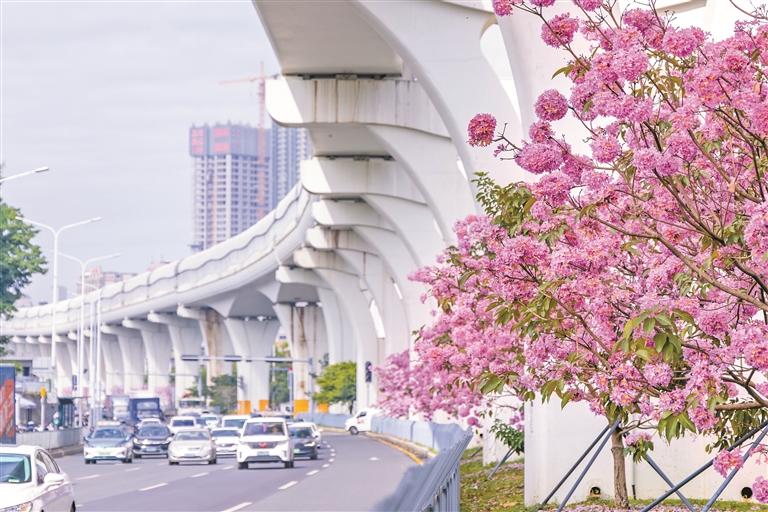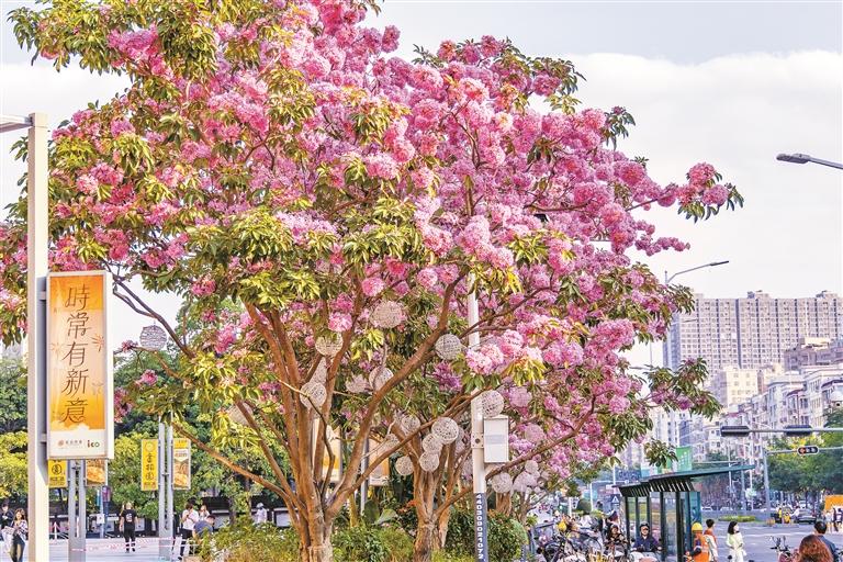 ▲布龙路的紫花风铃木迎来盛花期,成片粉紫色花朵缀满枝头,形成独特景观。