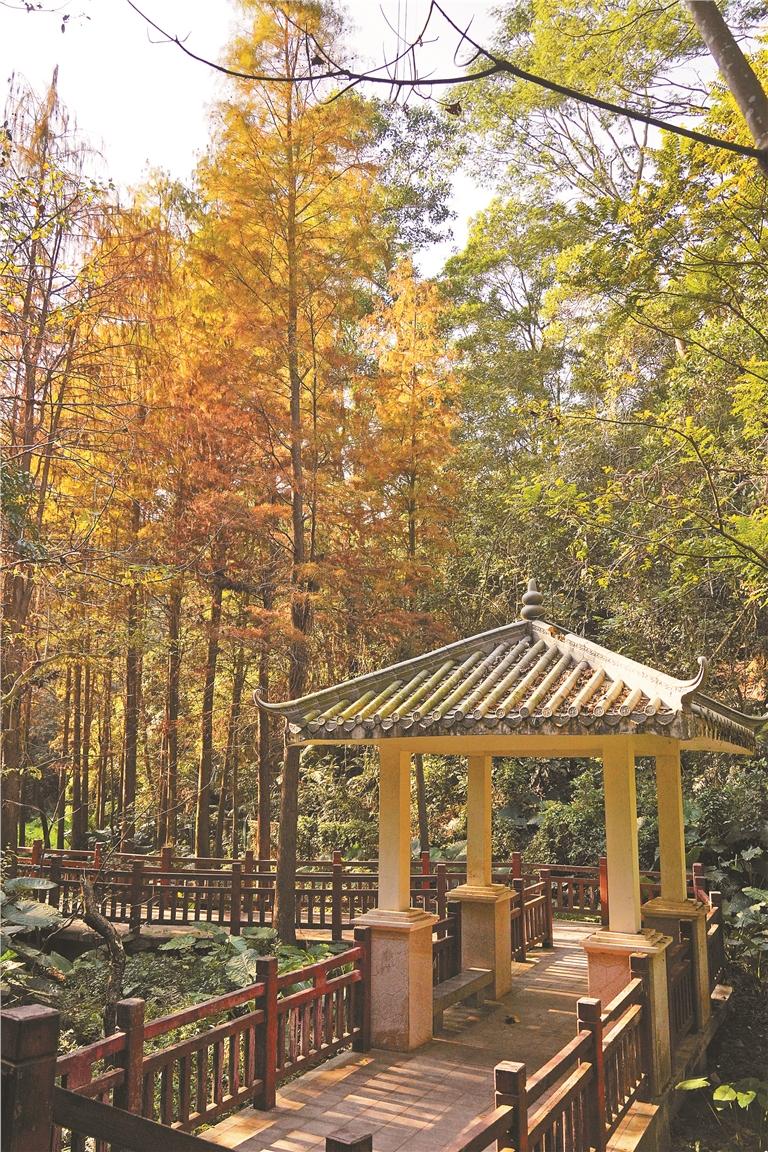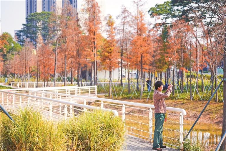观湖中心公园的落羽杉林迎来一年中最绚烂的时节,吸引众多市民拍照留影。